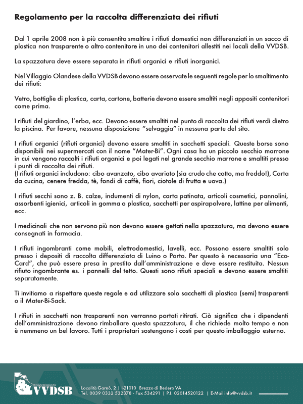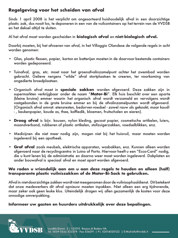 Das Villaggio Olandese gehört zur Gemeinde Brezzo di Bedero, wo auch die steuerliche Verwaltung und die Obliegenheit über öffentliche Bereiche liegt, wie z.B. die Zufahrtsstraßen. Die Gemeinde legt auch Grundlagen zur Gestaltung der Grundstücke fest (Pergolen, Überbauung).